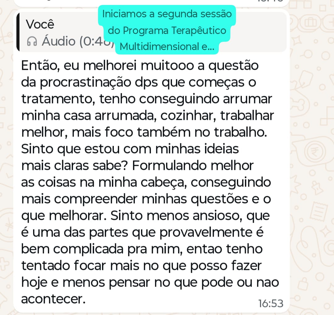E aqui, nós vamos juntos desenvolver um Plano Futuro de acompanhamento, para começar a aprofundar o seu tratamento. Utilizando ferramentas integradas energéticas e psicológicas, com o intuito de te libertar desse ciclo repetitivo de ações que não te levam a lugar algum. Aqui você conhecerá o poder das ferramentas que vão transformar seu cenário atual, realizar e materializar tudo que estava somente no mundo das ideias.